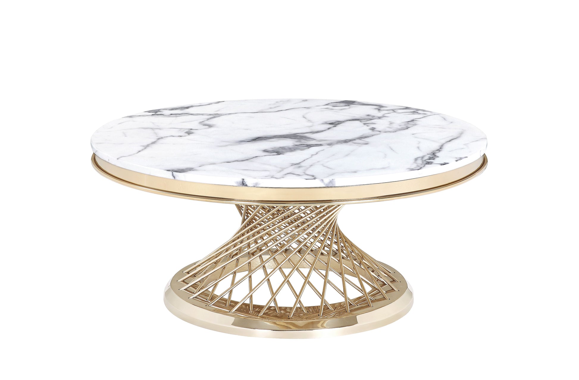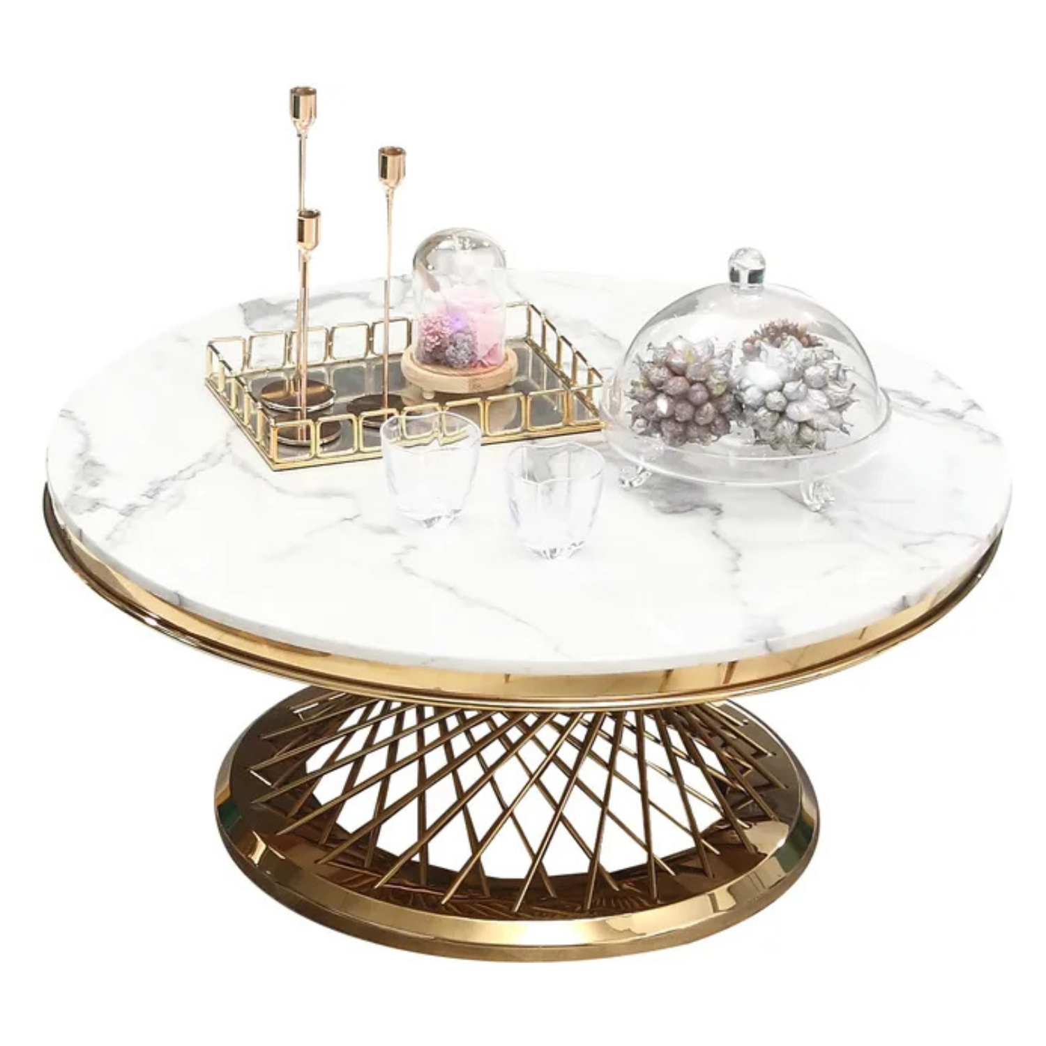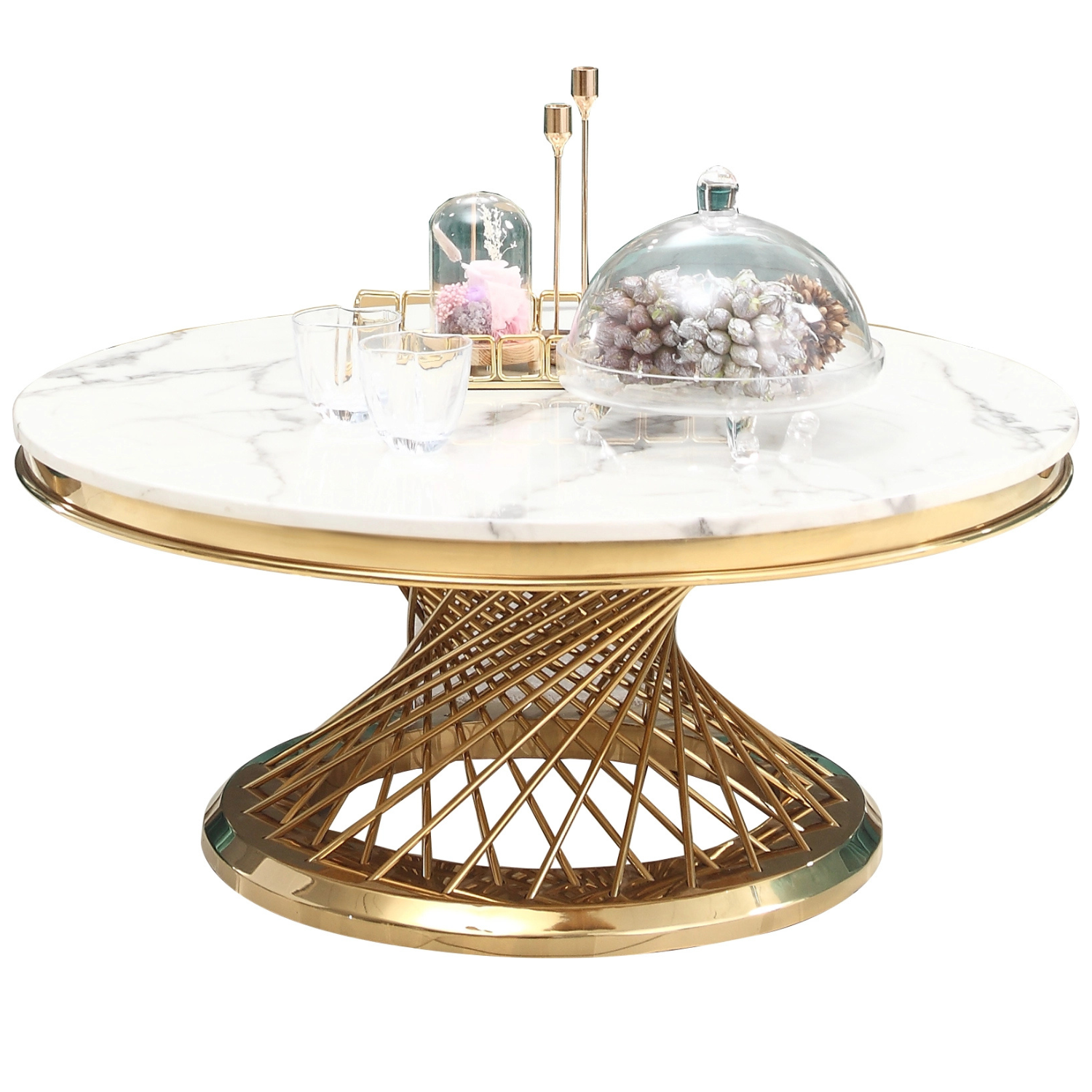 Die Tischplatte besteht aus echtem, weißem Marmor, der mit seiner einzigartigen Maserung jedes Stück zu einem Unikat macht. Das goldfarbene Gestell ist aus 100 % Edelstahl gefertigt und sorgt nicht nur für Stabilität, sondern auch für eine glänzende, luxuriöse Optik.