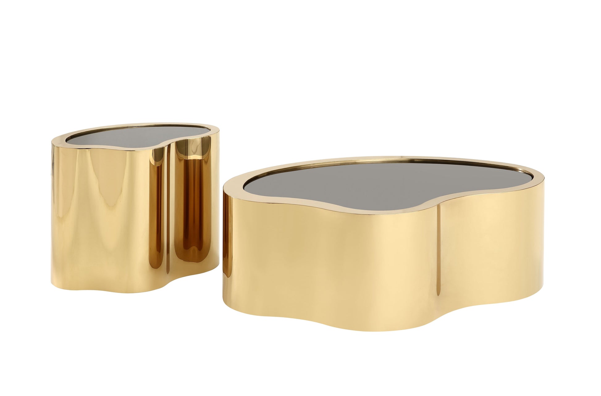 Verleihen Sie Ihrem Wohnzimmer ein luxuriöses Update mit diesem edlen Couchtisch-Set, bestehend aus zwei stilvoll geschwungenen Tischen in unterschiedlicher Größe. Die elegante Kombination aus gehärtetem Glas und hochglänzend vergoldeten Edelstahlbeinen schafft ein modernes und dennoch zeitloses Designstatement.