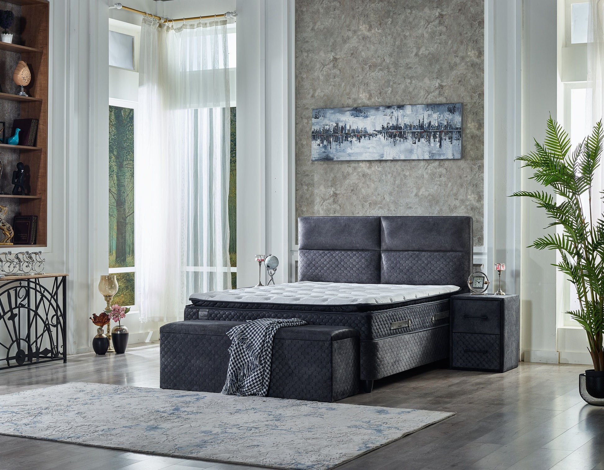 Bett aus anthrazit farbenem Samt mit Aufbewahrungsbox/Stauraum. Dieses Set beinhaltet eine 30 cm hohe Matratze mit Bonellfedern. Es handelt sich um eine stabile Matratze, die einem Druck von bis zu 120 kg pro Seite standhält inkl. Topper! Der Stauraum ist geräumig und lässt sich sehr einfach öffnen und schließen.