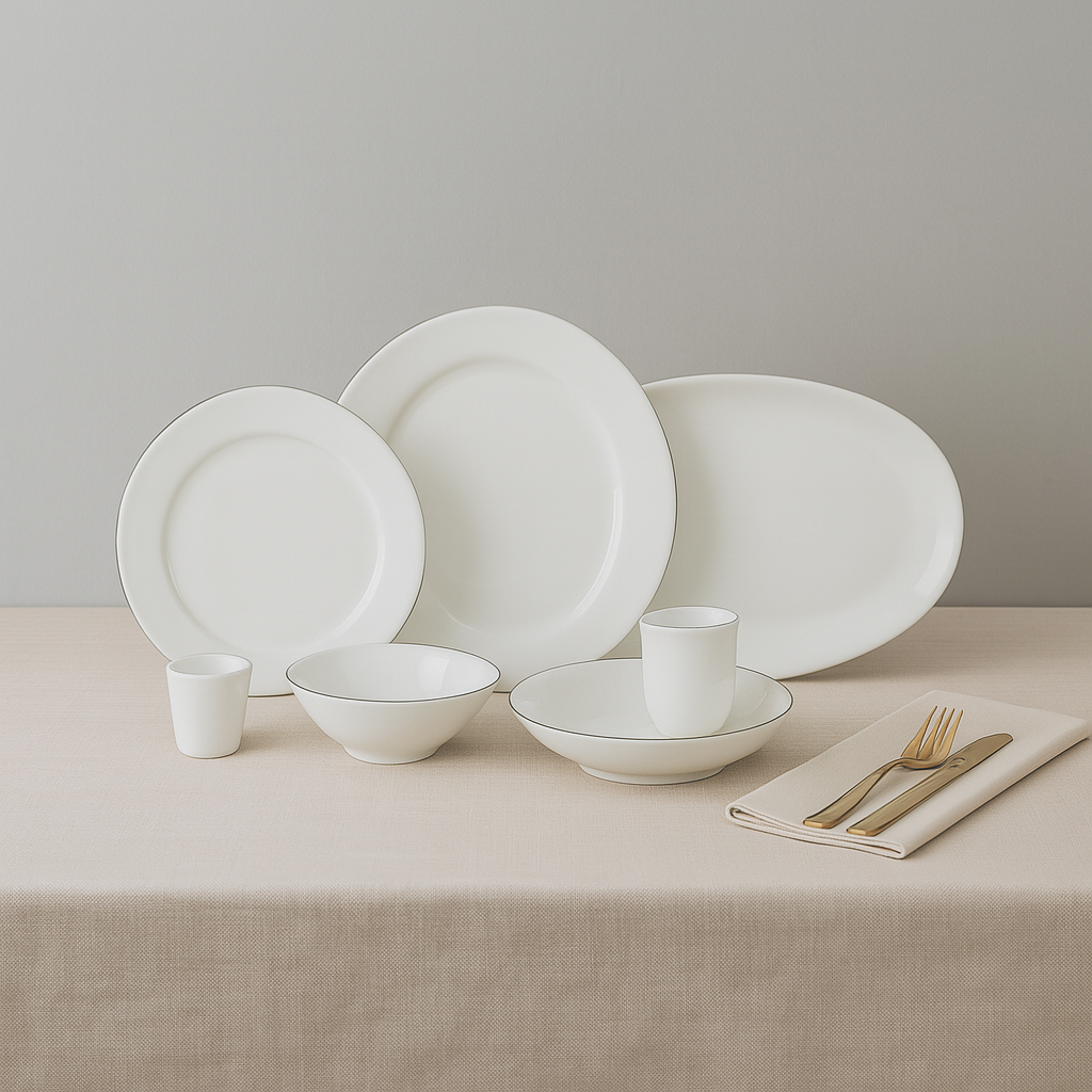 Das 27-teilige "Lunel" Geschirrset von Bricard ist ein Paradebeispiel für modernes, minimalistisches Design. Mit seiner klaren Linienführung, dem feinen Porzellan und der Auswahl in klassischem Weiß sowie stilvollen Varianten in Weiß-Gold oder mit Blumenmuster fügt sich dieses Set harmonisch in jedes Tischarrangement ein.