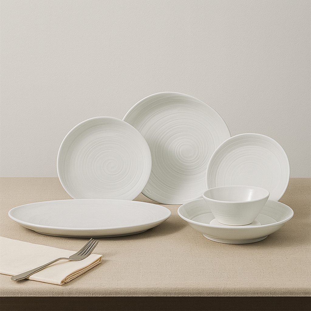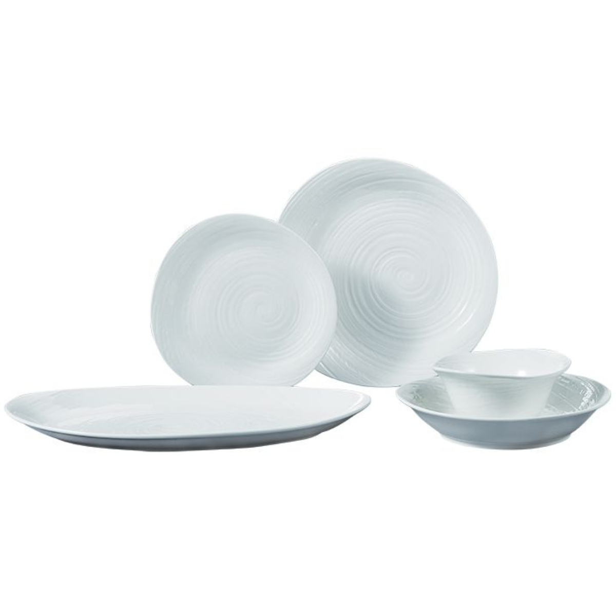 Bringen Sie moderne Eleganz auf Ihren Esstisch mit dem 25-teiligen Bricard Geschirrset „Revel“. Die geschwungene Spiralmusterung auf reinweißem Porzellan verleiht diesem Set einen stilvollen, zeitgemäßen Look – perfekt für den täglichen Gebrauch wie auch für besondere Anlässe.