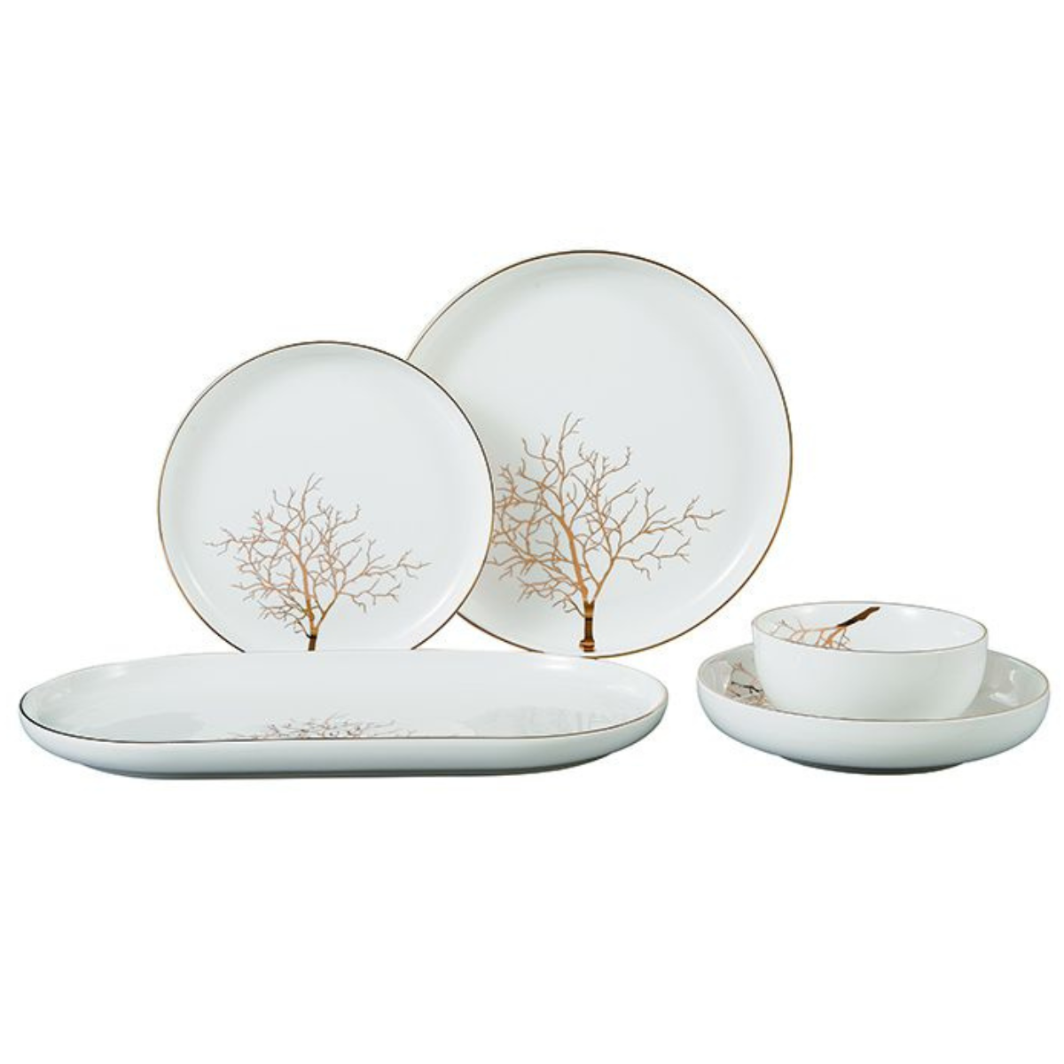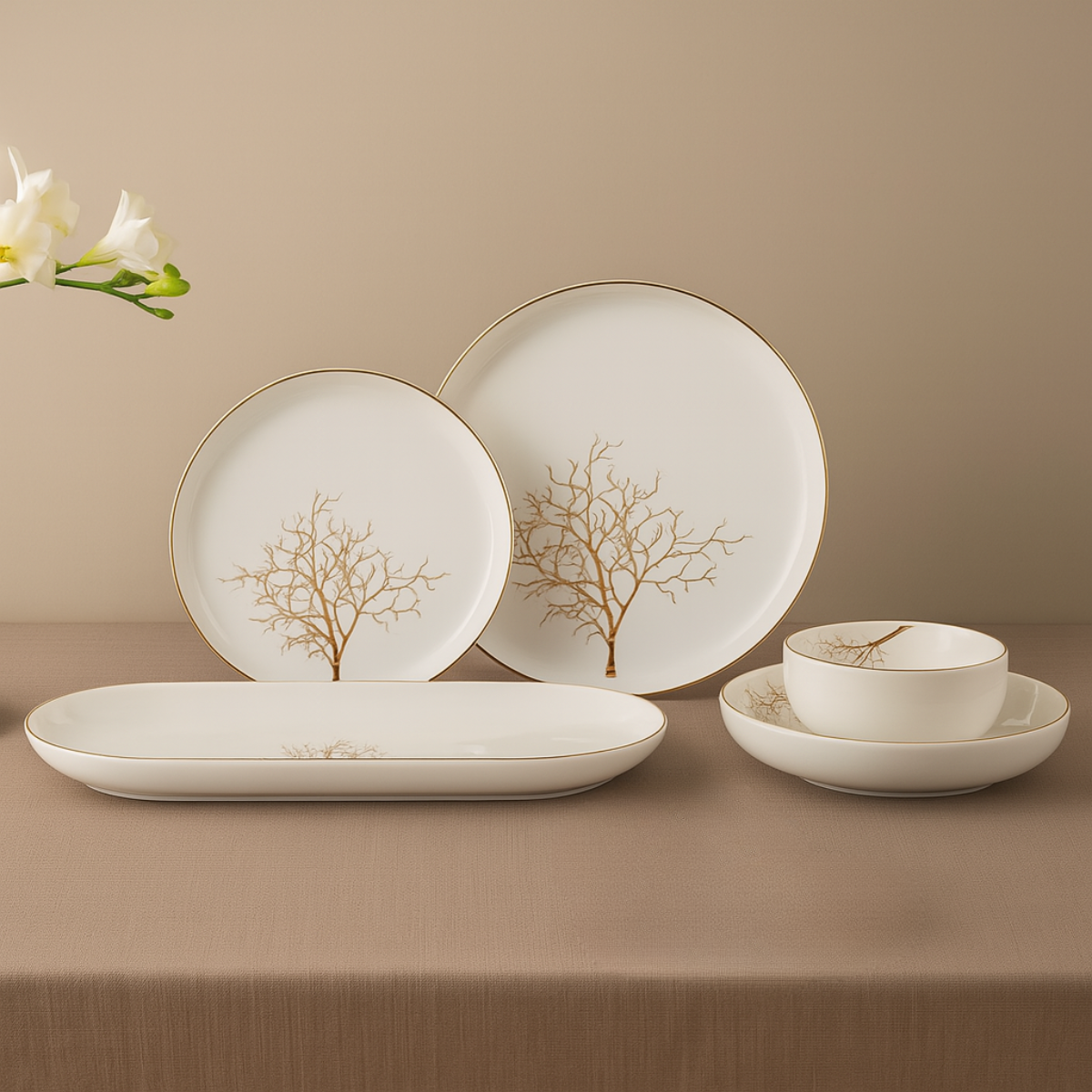 Das 25-teilige Geschirrset „Arles“ von Bricard kombiniert edles Design mit feiner Funktionalität. Ein elegantes, goldenes Baumdekor ziert jedes Teil dieses Sets und sorgt für ein stilvolles Ambiente auf Ihrem Tisch – ob zu besonderen Anlässen oder im Alltag.
