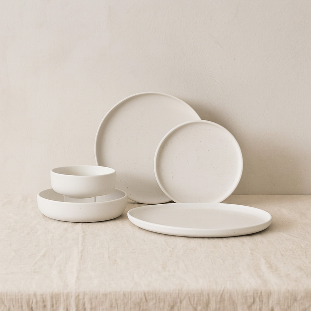 Das 25-teilige Geschirrset "Vertou" von Bricard kombiniert moderne Schlichtheit mit rustikalem Charme. Die leicht gesprenkelte Oberfläche in Weiß-Grau und mattweißer Optik verleiht jedem Gedeck eine natürliche Eleganz – perfekt für stilvolle Alltagsmahlzeiten und besondere Anlässe.