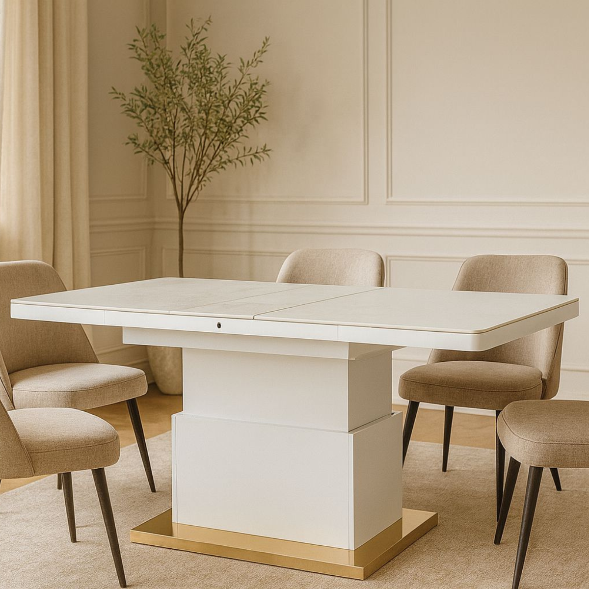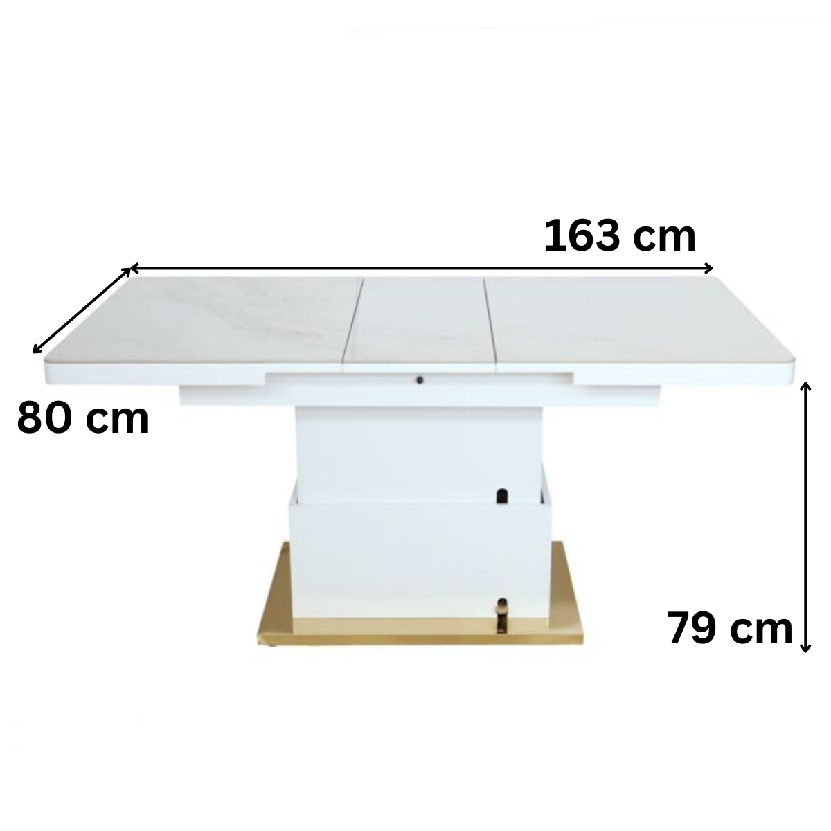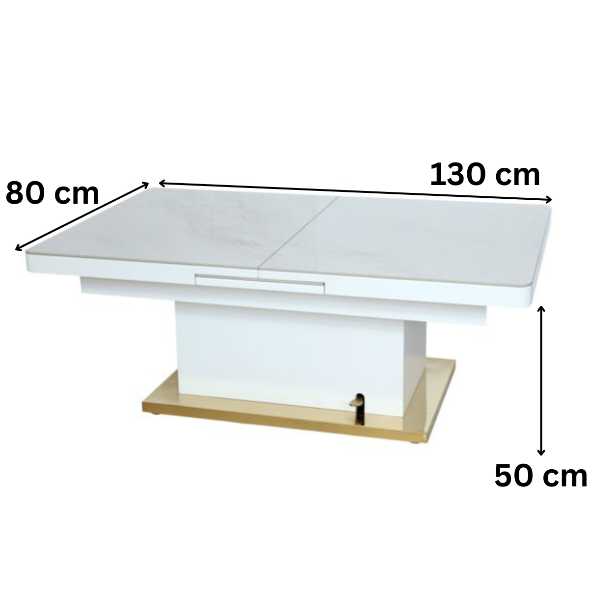 Dank der höhenverstellbaren und ausziehbaren Funktion lässt sich der Tisch flexibel anpassen – ob als niedriger Couchtisch für gemütliche Abende oder als erhöhter Esstisch, wenn mehr Platz benötigt wird. Die hochwertige Oberfläche in Weiß-Gold, Weiß-Silber oder Schwarz sorgt für Eleganz und fügt sich perfekt in unterschiedliche Wohnstile ein.