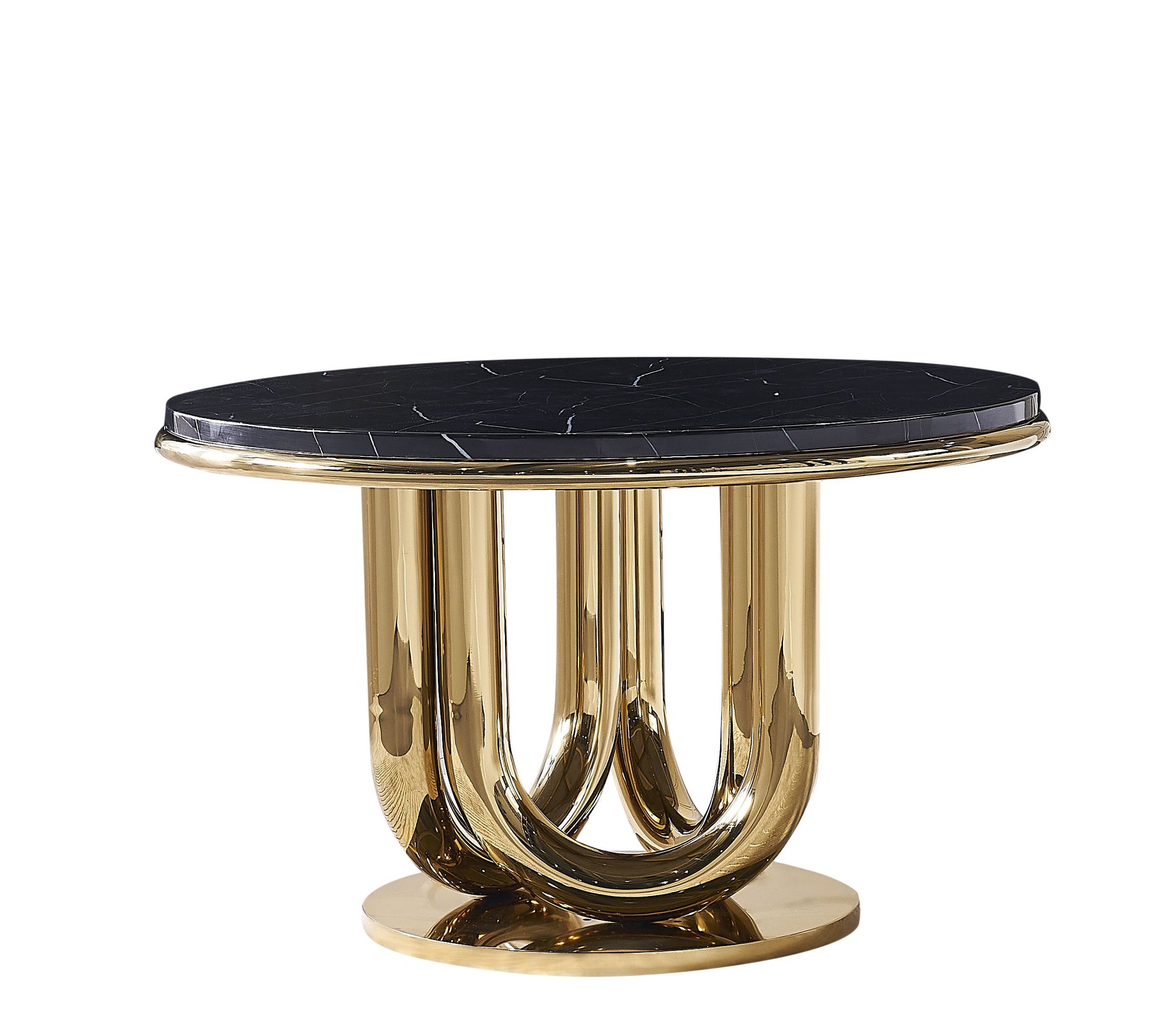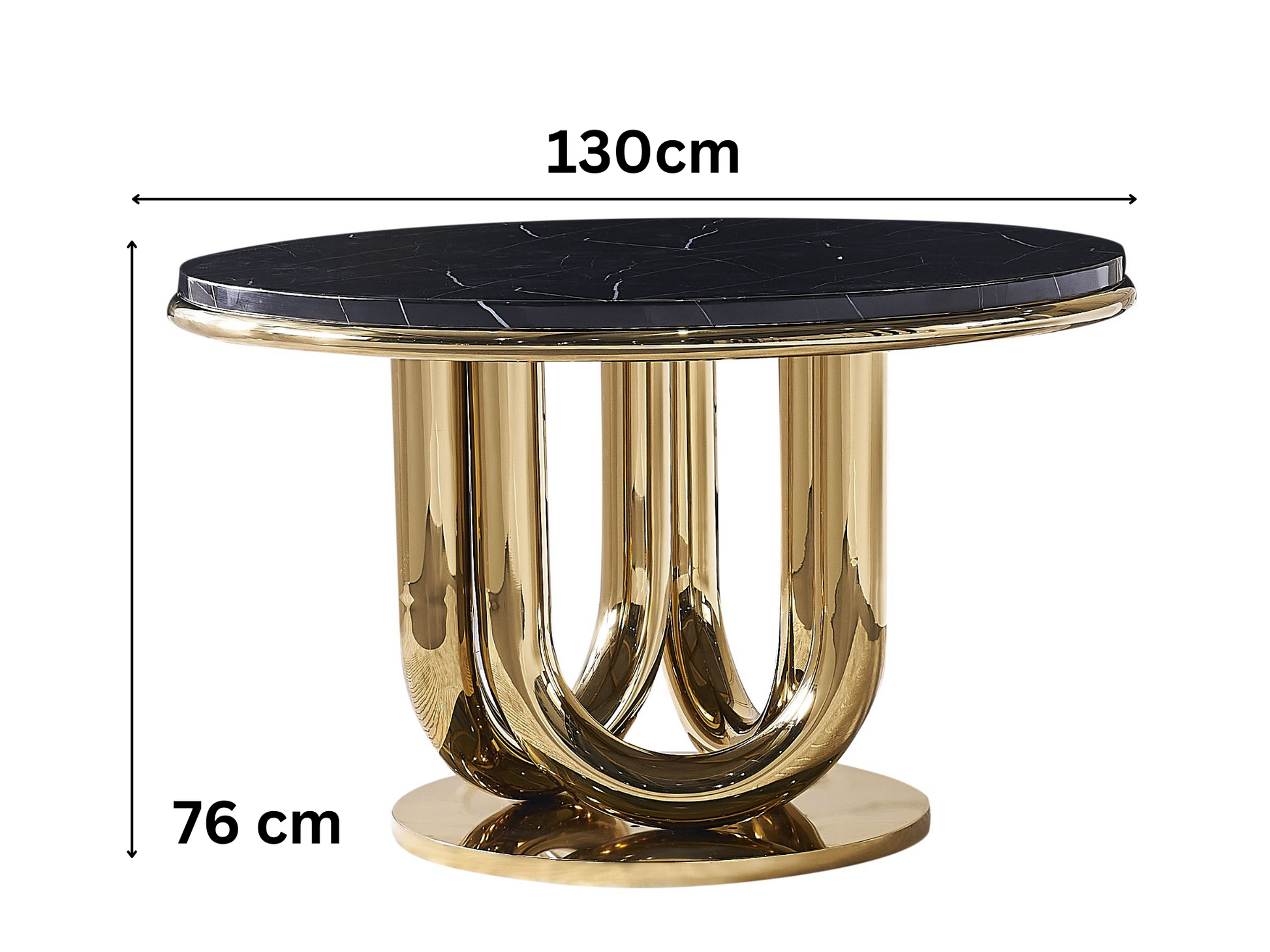 Ein Tisch wie ein Statement: Dieser elegante Esstisch mit schwarzer Marmorplatte und kunstvoll geschwungenem vergoldetem Edelstahlgestell verkörpert modernen Luxus in seiner schönsten Form. Mit seinem einzigartigen Untergestell in gebogener Form zieht er alle Blicke auf sich – perfekt für stilvolle Essbereiche mit Charakter.