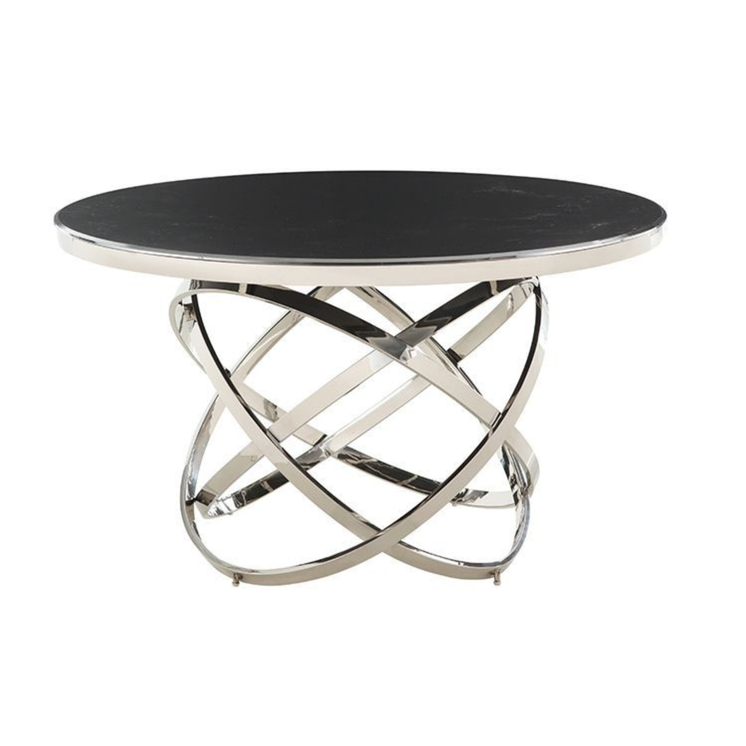 Das Besondere: Das außergewöhnlich geformte Edelstahlgestell in polierter Silberoptik zieht alle Blicke auf sich. Die ineinander verschlungenen Metallbögen sorgen nicht nur für eine stabile Basis, sondern unterstreichen das moderne, kunstvolle Design dieses Möbelstücks.