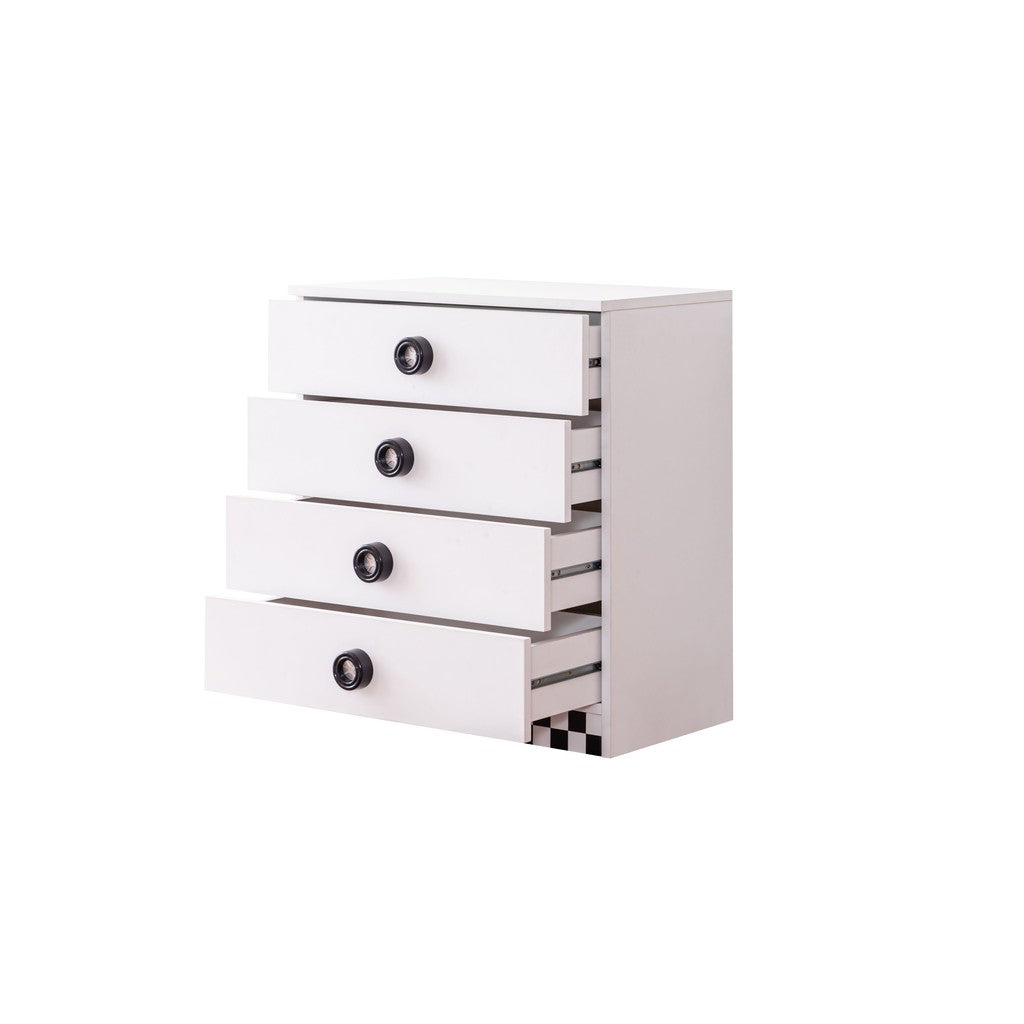 Weiße Kommode mit 4 Regalen für praktische Aufbewahrung. Die Griffe bestehen aus coolen kleinen Autorädern und die untere Vorderseite ist mit einer Abschlusslinie gestaltet. Dieser Artikel enthält insgesamt 2 Packungen.