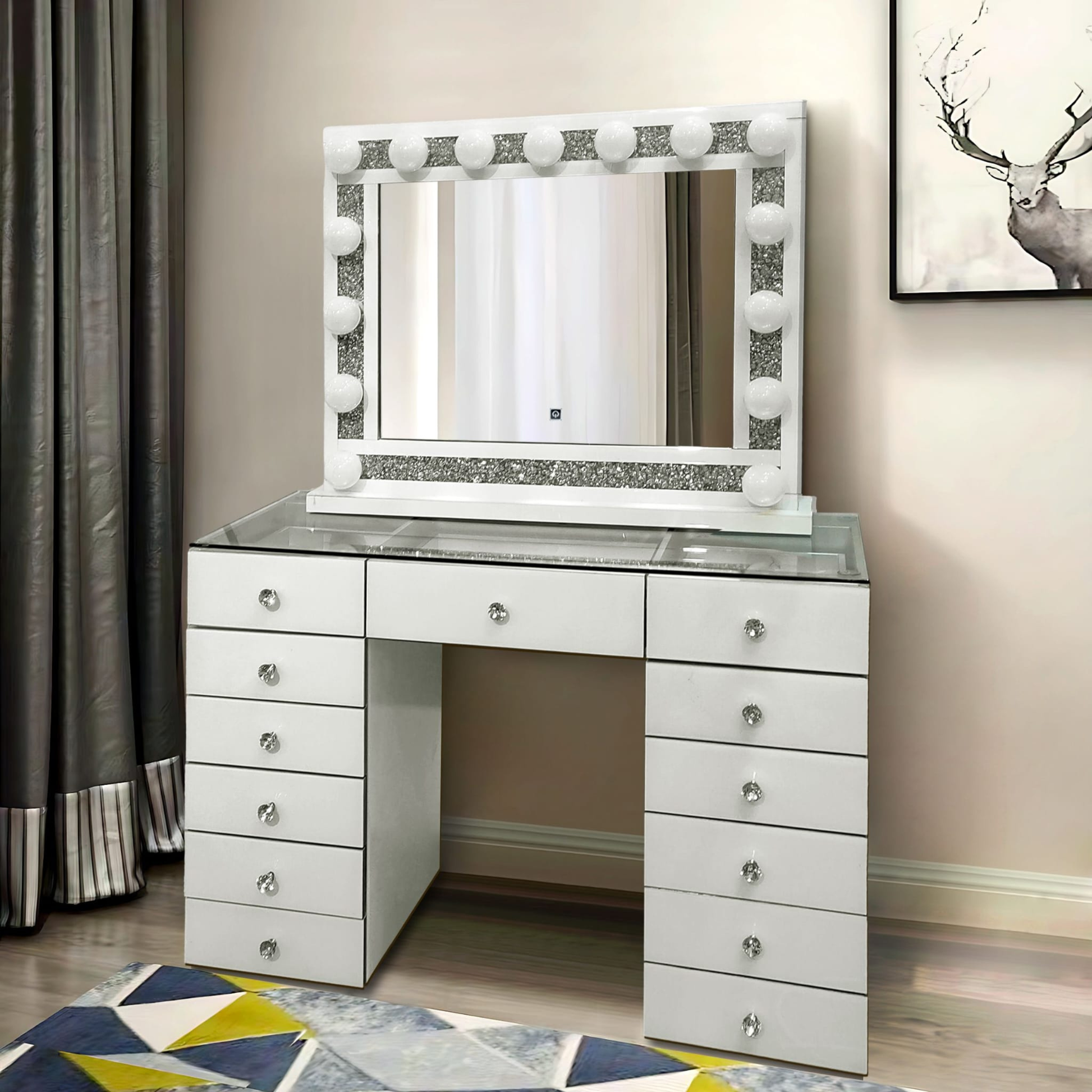 Erhältlich in drei zeitlosen Farben – Weiß, Schwarz und Gold, fügt sich der Schminktisch harmonisch in moderne, glamouröse oder klassische Wohnstile ein.