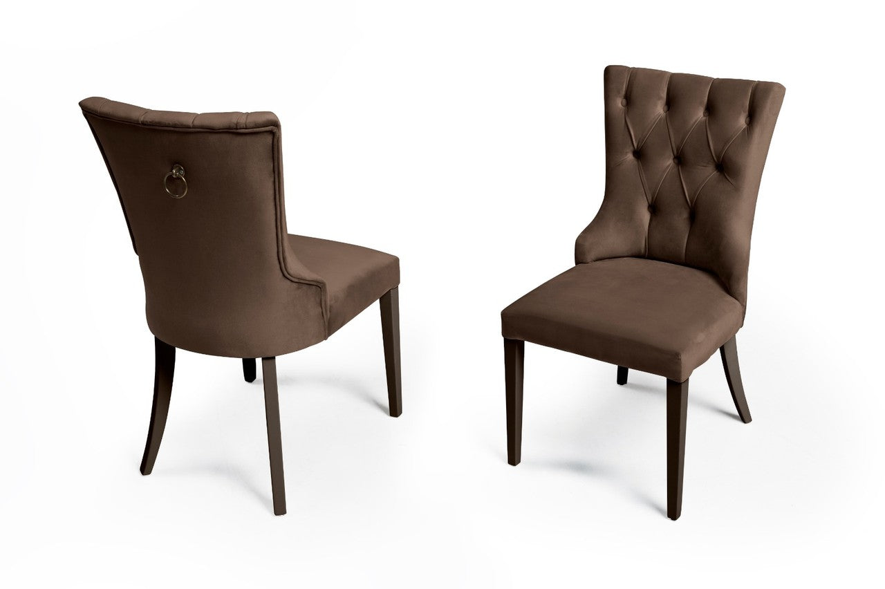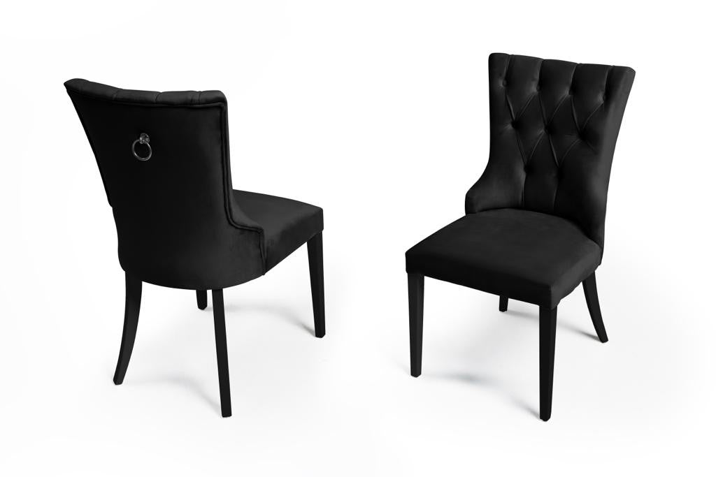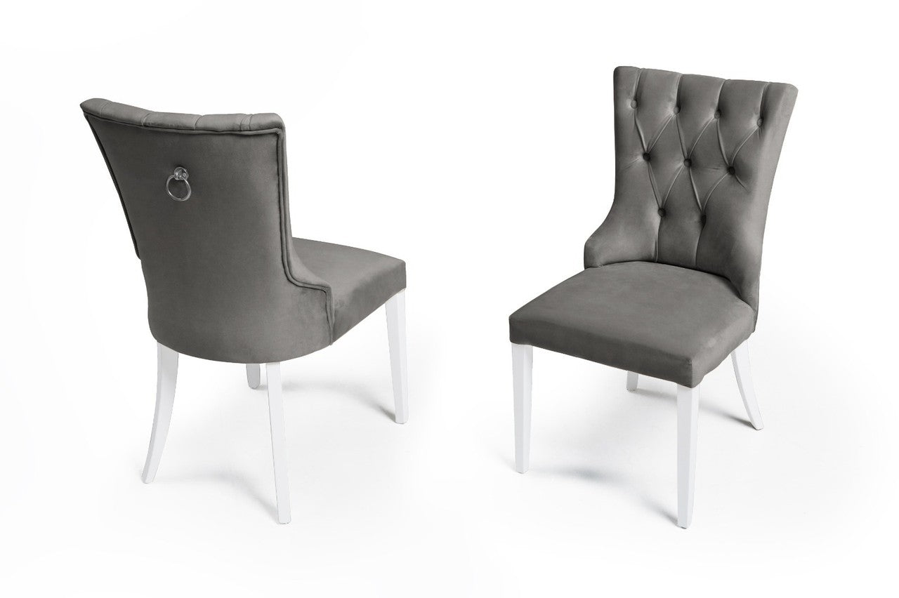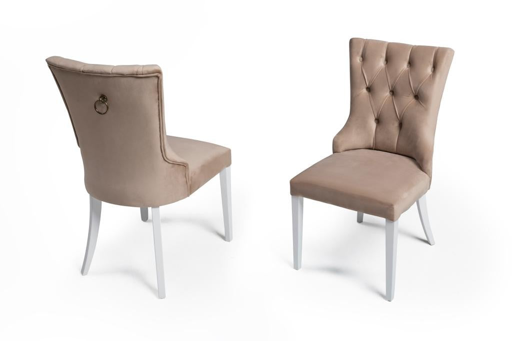 Der Stuhl wurde nach ergonomischen Gesichtspunkten entworfen. Mit einer Rückenlehne, einem weichen, atmungsaktiven Sitz aus Samt, den weiß lackierten Holzbeinen und einem verchromten Handgriff an der Rückseite wird ihr Wohnzimmer/Ihre Küche zu einem absoluten Blickfang.